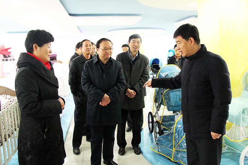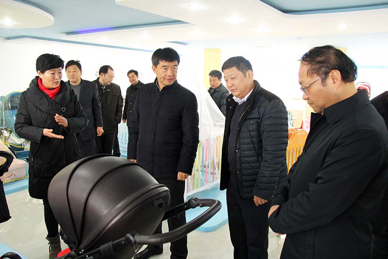 孫書記在公司樣品間觀看了該企業(yè)生產(chǎn)出來的高中低檔童車童床