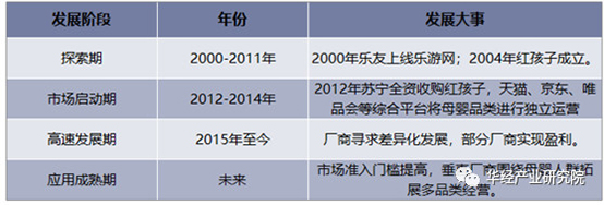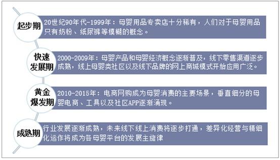 中國母嬰行業(yè)發(fā)展經(jīng)歷了四個階段,分別是起步期、快速發(fā)展期、黃金爆發(fā)期及成熟期。當(dāng)前母嬰行業(yè)發(fā)展逐漸成熟,未來線下線上消費將逐步打通,差異化經(jīng)營與精細化運作將成為各母嬰平臺的發(fā)展主旋律。