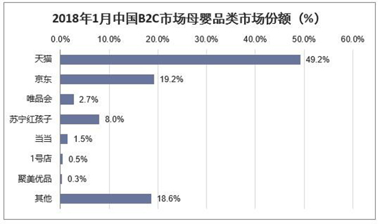 從平臺格局來看,天貓、京東等綜合電商平臺占據(jù)主要市場份額,2018年1月合計占比68.40%。垂直母嬰電商在SKU、用戶流量上雖然拼不過綜合電商,但是它們可以用較少但是精選的SKU縮短消費者的決策時間,解決選擇困難癥的問題,而且因為垂直母嬰電商客戶群體的集中性,向線上社區(qū)、育兒記錄工具服務(wù)切入也更為專業(yè)和容易,因此在與強勢的綜合電商的競爭過程中,依然能用差異化的產(chǎn)品和服務(wù)占據(jù)一定的市場份額。