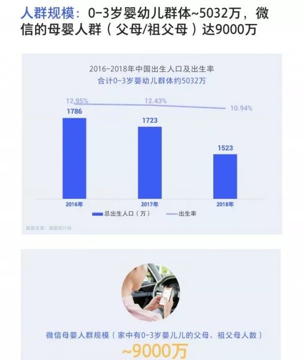 1、人群規(guī)模:0-3歲嬰幼兒群體~5032萬,微信的母嬰人群(父母/祖父母)達(dá)9000萬。