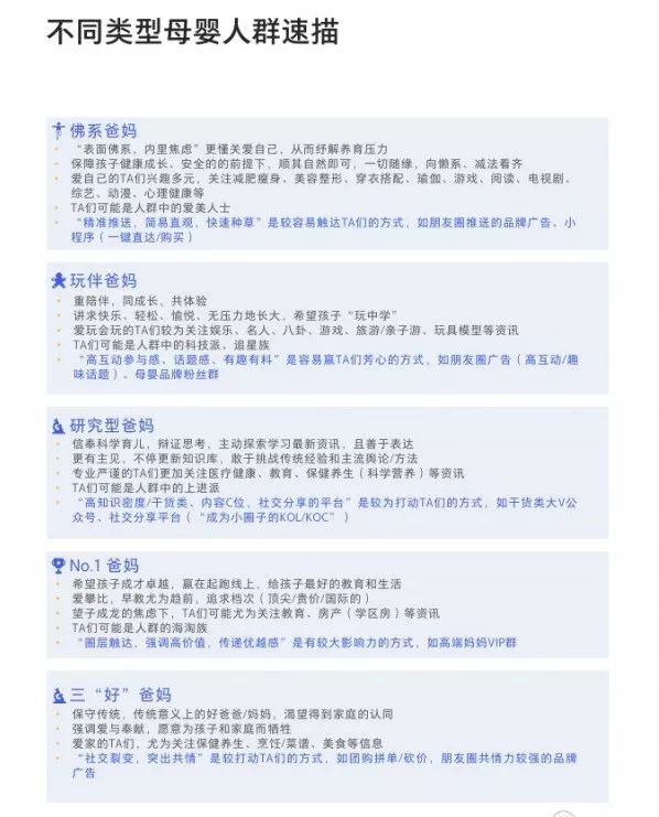 ·育兒方式更多元,愛自己的佛系爸媽、愛玩會(huì)玩的玩伴爸媽、專業(yè)嚴(yán)謹(jǐn)?shù)难芯啃桶謰?,成才卓越的No.1爸媽、愛家奉獻(xiàn)的三“好”爸媽…針對(duì)不同細(xì)分群體的精準(zhǔn)營(yíng)銷尤為重要