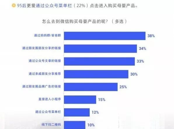 ·95后更愛通過公眾號(hào)菜單欄(22%)點(diǎn)擊進(jìn)入購買母嬰產(chǎn)品。
