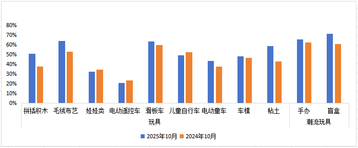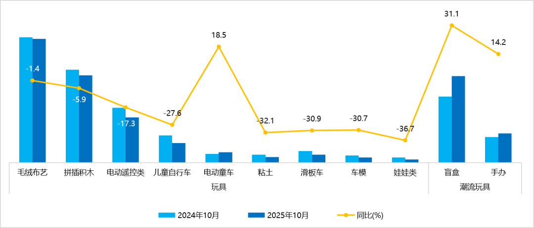 根據中國玩具和嬰童用品協(xié)會(簡稱中國玩協(xié))對天貓平臺10月重點品類銷售數據監(jiān)測顯示,玩具重點品類中,電動童車銷售額同比增長18.5%;潮流玩具重點品類中,盲盒、手辦銷售額分別同比增長31.1%和14.2%;嬰童用品重點品類中,童床和游戲圍欄銷售額分別同比增長64.6%和16.5%。