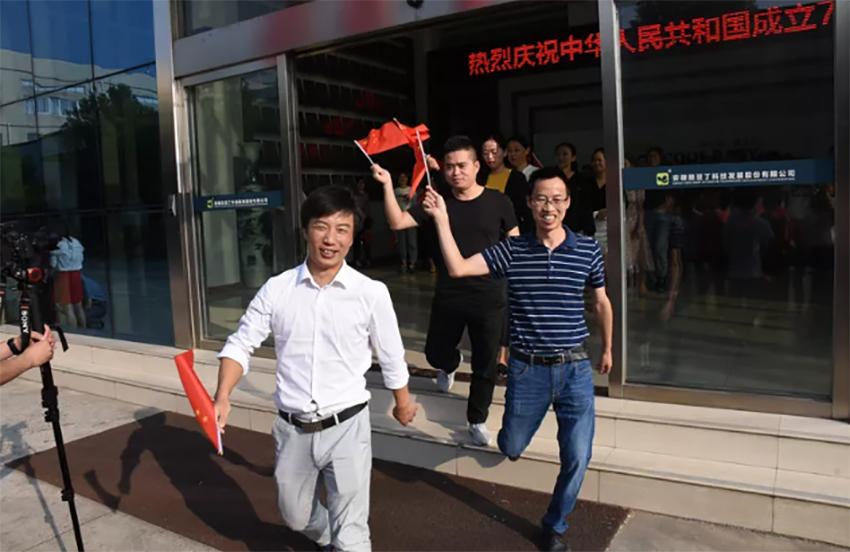 董事長張迎年帶領(lǐng)員工們舉旗高呼“我愛我的祖國”“我愛我的公司”“我愛我的家”